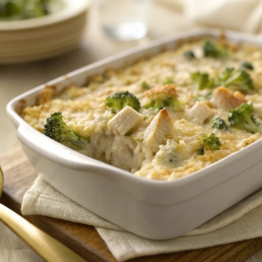 This chicken broccoli rice casserole combines tender chicken, fluffy rice, crisp broccoli, and a creamy homemade sauce baked until bubbly and golden. It is a comforting family-friendly dinner perfect for busy weeknights.