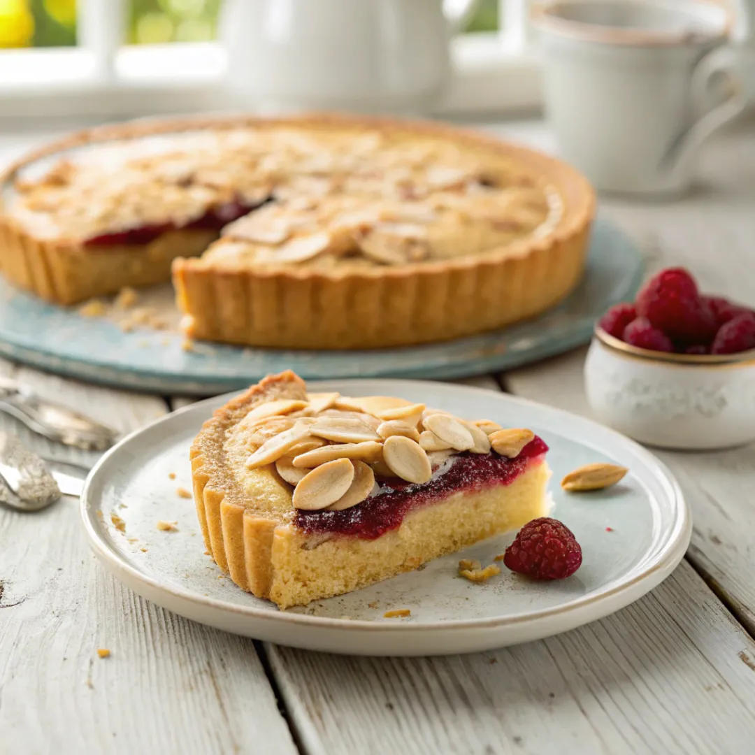 Classic Bakewell tart with buttery pastry, raspberry jam, and almond frangipane filling.