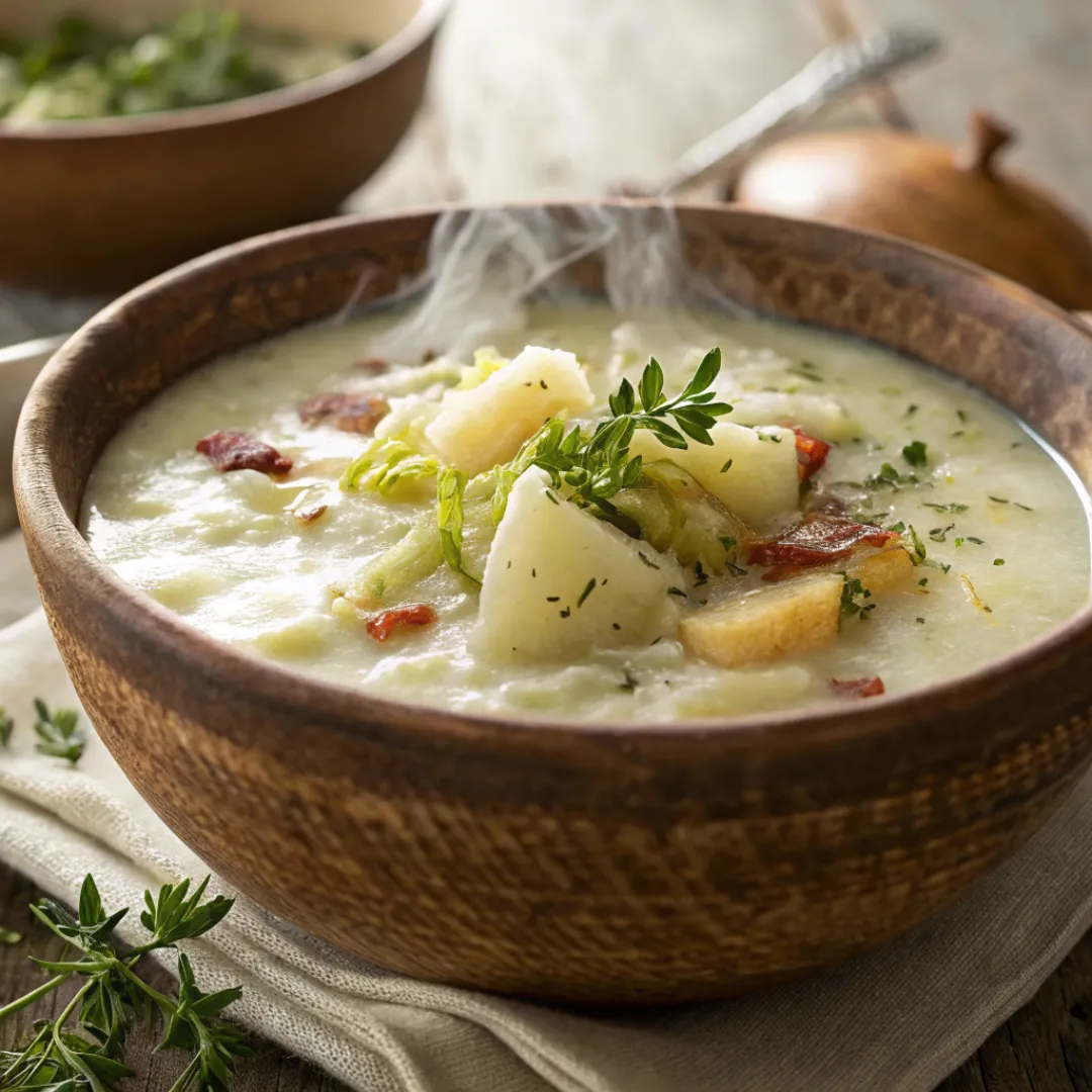 Colcannon soup uses potatoes, cabbage, milk, and butter as its base. The soup version blends these ingredients into a creamy, comforting dish while keeping the classic flavors intact.