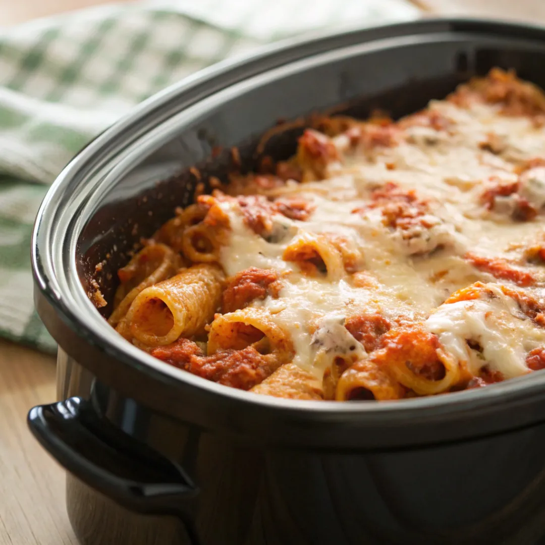 Crockpot Baked Ziti with tender pasta, rich marinara, and melted cheese for easy comfort food.