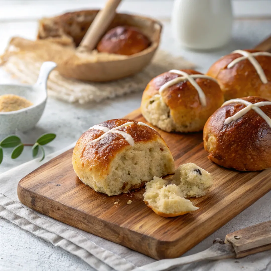 Soft and spiced Hot Cross Buns with raisins or currants and icing crosses, perfect for Easter or breakfast.