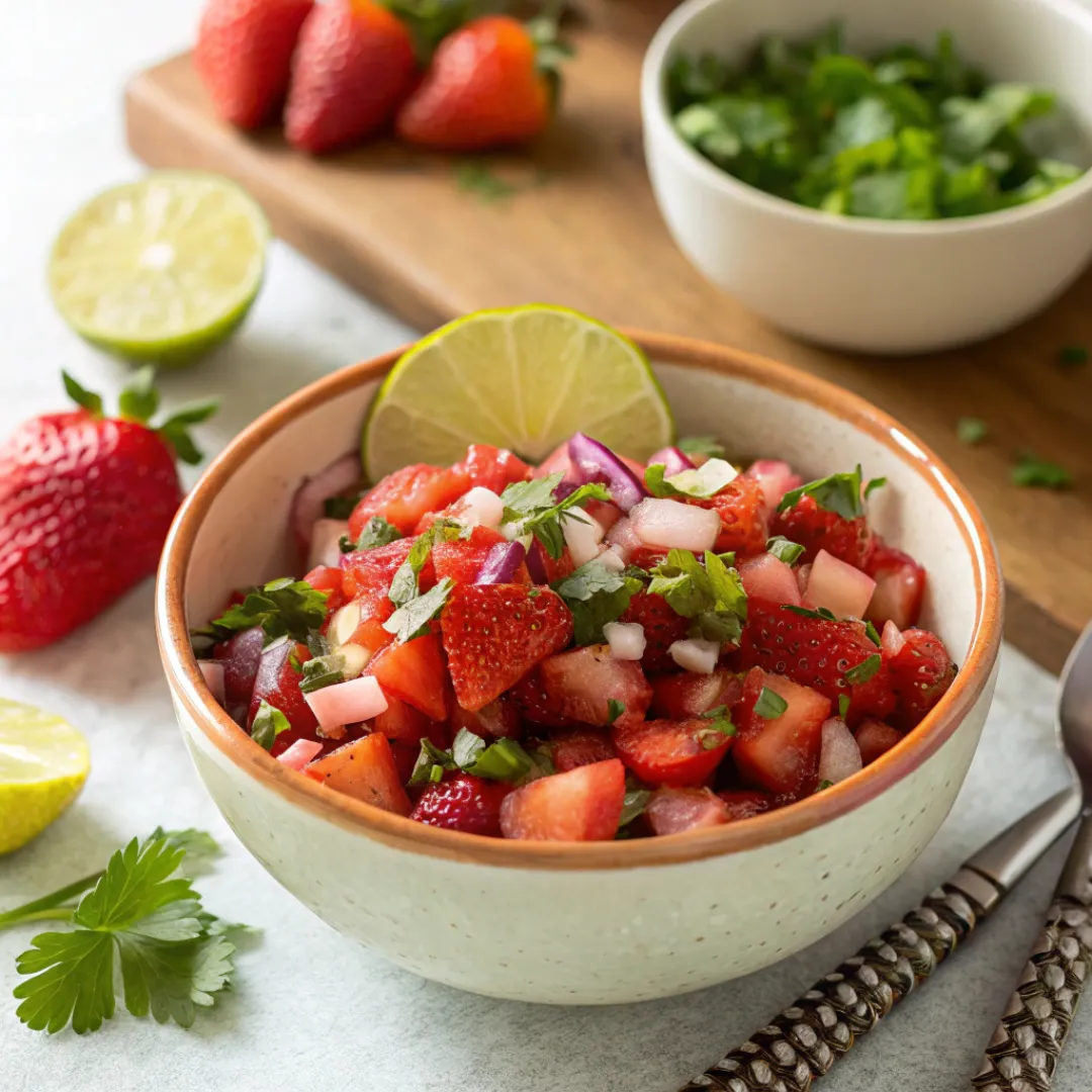 Fresh strawberry salsa with lime juice, cilantro, and jalapeño. Sweet, zesty, and perfect for dipping or topping.