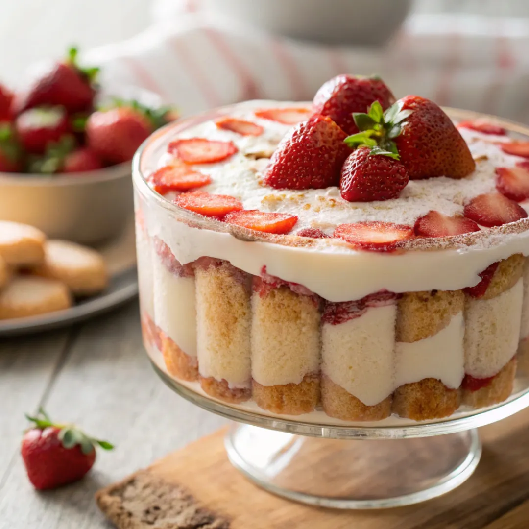 Strawberry Tiramisu is a fresh, no-bake dessert layered with strawberries, cream, and ladyfingers for a light and elegant treat.
